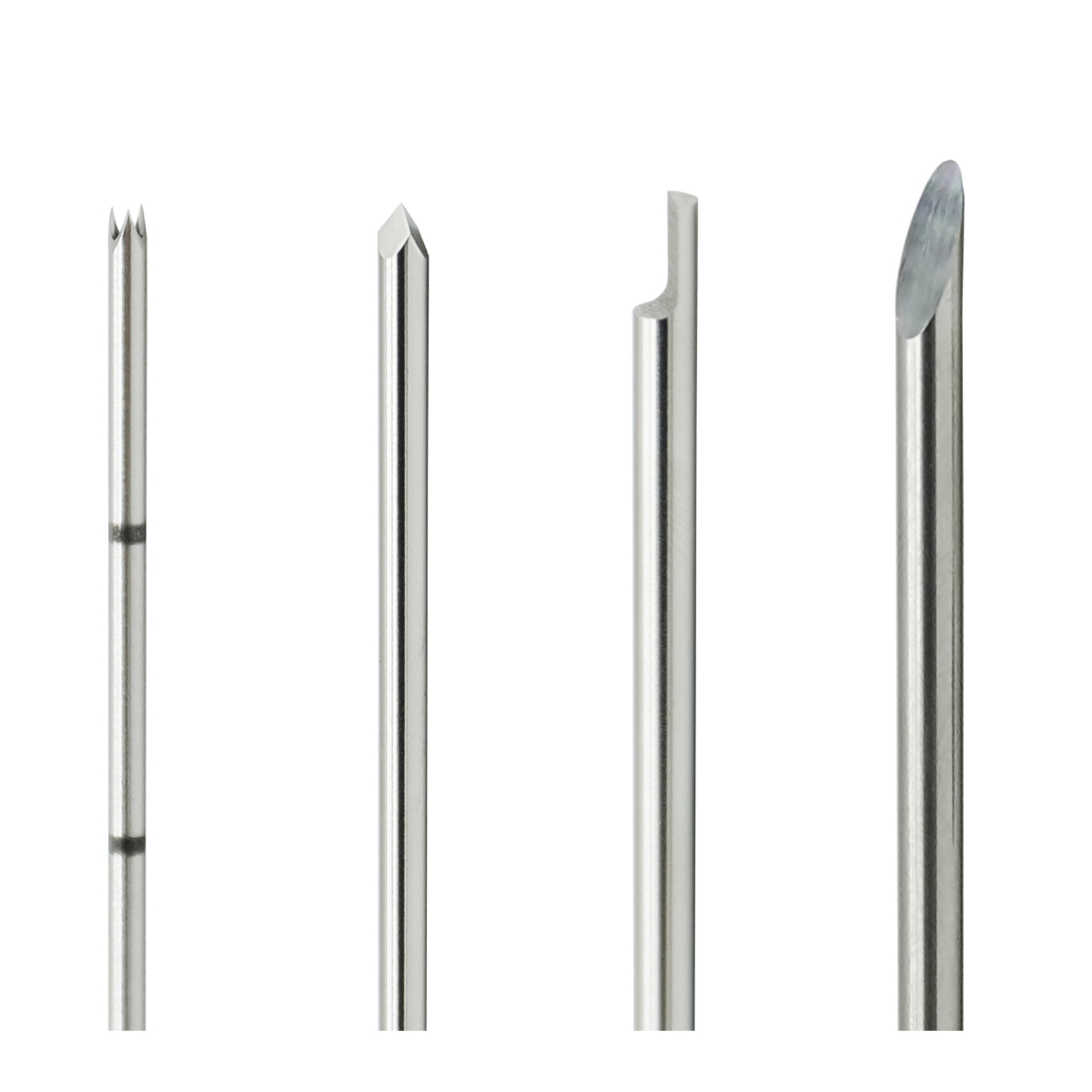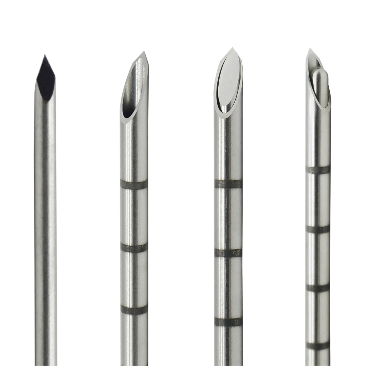| Needle tube characteristics | Outer tube: Needle tip pentagonal/trigonal/harpoon type/flat head, perforated, scale, tail flared/sandblasted inner tube: Round head/bevel/Triangle/flat head, tail flattened, slotted |